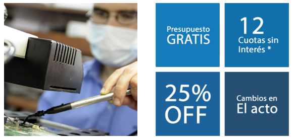 Esta semana 25% de descuento, Presupuestos gratis, Hasta 12 cuotas sin interés, Cambio de piezas en el acto